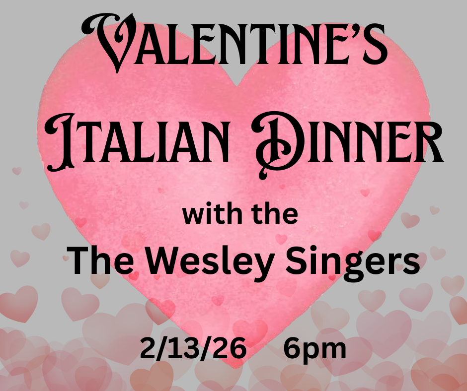 Join us February 13th at 7 pm for a Valentine’s Italian Dinner with music by the Wesley Singers. Cost is $15 per person
